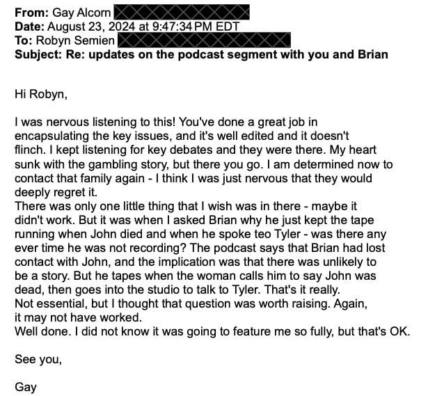 In this episode, I have a conversation with an Australian journalist named Gay Alcorn. In 2017, Gay wrote a column criticizing my podcast, S-Town, as “morally indefensible”. When we were making this episode, my team and I did something I don’t think I’ve ever done before, in 15 years as a journalist. We sent Gay a full draft of the episode to listen to before we aired it.