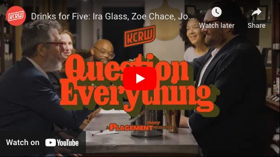 We’ll be back with our next episode on September 26th. Also, be sure to check out the beautiful video of our Drinks for Five episode, with Ira Glass, Zoe Chace, Astead Herndon, and Jonathan Eig, on YouTube. It’s so good.